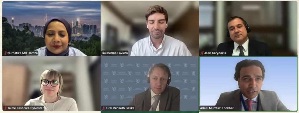 IGWG negotiators (clockwise from top L): Nurhafiza Hamza (Malaysia), moderator Guilherme Faviero (AIDS Health Foundation), Jean Karydakis (Brazil), Taime Sylvester (Namibia), Eirik Rodseth Bakka (Norway) and Adeel Mumtaz Khokhar (Pakistan).