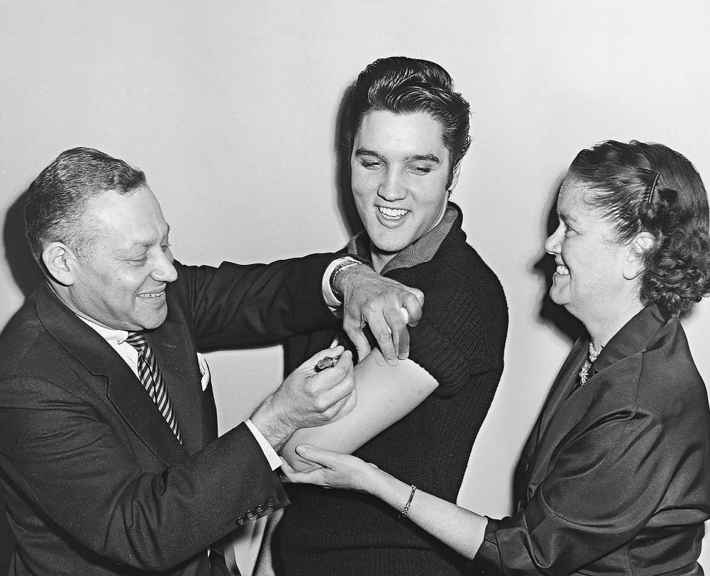 Rock icon Elvis Presley getting his polio vaccination in 1956, as New York City Commissioner of Health Leona Baumgartner (right) held his arm and Assistant Commissioner Harold Fuerst administered the vaccine. His public vaccination massively boosted polio immunisation.