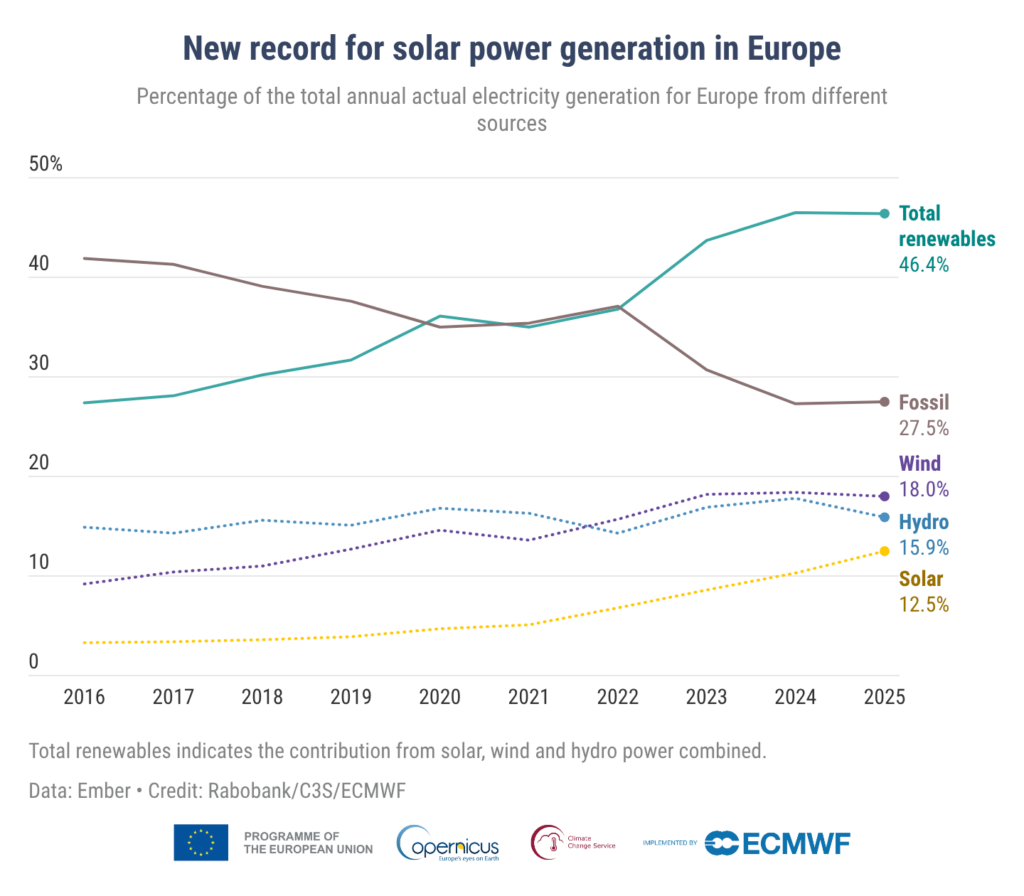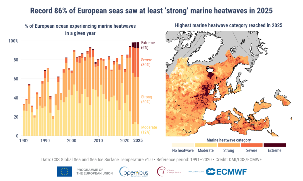 Record European Heatwaves Shrink Glaciers and Diminish Snow Cover in 2025 Climate change 29/04/2026 • Disha Shetty Share this: Share on X (Opens in new window) X Share on LinkedIn (Opens in new window) LinkedIn Share on Facebook (Opens in new window) Facebook Print (Opens in new window) Print Share on Bluesky (Opens in new window) Bluesky Europe experienced record extremes in 2025, according to WMO’s latest assessment. Around 95% of Europe experienced above-average temperatures in 2025, with record heatwaves from the Mediterranean to the Arctic region. This caused rapid loss of glacier mass and snow cover, according to the latest State of the European Climate report by the World Meteorological Organization (WMO) released on Thursday. All of Europe’s glaciers saw a net mass loss, with Iceland recording its second-largest glacier loss on record. The continent experienced dangerously high air temperatures, drought, heatwaves and record ocean temperatures. This has translated into economic and biodiversity loss affecting countries and ecosystems across the continent. “Europe is the fastest-warming continent, and the impacts are already severe. Almost the whole region has seen above-average annual temperatures,” said Florian Pappenberger, Director-General of the European Centre for Medium-Range Weather Forecasts (ECMWF), an inter-governmental organisation that contributed to the report along with WMO. Also read: Europe is World’s Fastest Warming Continent With Record Temperatures in 2024 Europe is warming twice as fast as the global average Europe is now the fastest-warming continent, warming twice as fast as the global average. The impact of the temperature increases is most visible in the coldest regions, such as the Arctic and the Alps. Snow and ice play a critical role in slowing climate change by reflecting sunlight into space in what is known as the albedo effect. “In 2025, sub-Arctic Norway, Sweden and Finland recorded their worst heatwave on record with 21 straight days and temperatures exceeding 30°C within the Arctic Circle itself,” Pappenberger of ECMWF said. This also pushed up temperatures within and adjacent to the Arctic Circle to over 30°C, peaking at 34.9°C in Frosta, Norway. Ironically, low levels of air pollution in Europe allow more solar radiation to reach the surface, leading to a higher rate of warming. The number of cold stress days when temperatures drop below normal is also reducing. Nearly 90% of the continent experienced fewer cold stress days than average, and minimum temperatures remained above average for most of the year. Hot, dry conditions resulted in more wildfires. A record total area of around 1,034,000 hectares was burnt across Europe – an area larger than Cyprus. Spain, Cyprus, the United Kingdom, the Netherlands, and Germany recorded their highest wildfire emissions on record in 2025. Record loss of glacier mass Glaciers across Europe lost mass in 2025, with the highest loss recorded in Iceland. The Greenland Ice Sheet, which is the largest ice mass in the northern hemisphere and covers 80% of Greenland, lost 139 gigatonnes (139 billion tonnes) of ice. This is equivalent to 1.5 times the volume stored in all glaciers in the European Alps. Such ice loss contributes to rising global sea levels, with every centimetre increase exposing an additional six million people to coastal flooding. Overall, snow cover was 31% below average, affecting 1.32 million square kilometres, which is equivalent to the combined area of France, Italy, Germany, Switzerland, and Austria. “The ESOTC 2025 paints a stark picture: the pace of climate change demands more urgent action. With rising temperatures, and widespread wildfires and drought, the evidence is unequivocal; climate change is not a future threat, it is our present reality,” Samantha Burgess, Strategic Lead for Climate at ECMWF said. Rising ocean heat, reducing river flow Nearly 86% of European waters saw strong marine heatwaves in 2025. Oceans absorb 90% of the atmosphere’s excess heat due to the burning of fossil fuels. In 2025, Europe’s sea surface temperature was the highest on record. Around 86% of the region experienced strong marine heatwaves, disrupting fish and the ocean plants. Changes in rainfall and snowfall patterns have also affected the flow in 70% of Europe’s rivers. In May 2025, around half of Europe (53%) was affected by drought conditions. “Maintaining our own state-of-the-art, reliable data records of our Earth system is vital for making informed policy decisions in our rapidly changing climate. Copernicus is pivotal to help us preserve our sovereignty, our environment, food systems, safety, and economy,” said Mauro Facchini, Head of the European Commission’s Copernicus, is the European Union’s Earth Observation Programme. Renewable growth and actionable items for policymakers The share of renewables in Europe’s energy mix has gone up, supported by the growth in solar energy. A silver lining in the report is the growth of renewable energy, which in 2025 supplied nearly half (46.4%) of Europe’s electricity. Solar power contributed around 12.5% of this, a new regional record. Countries have begun to see energy security as a national security issue, and that appears to be one of the reasons driving the growth of renewables, including the adoption of nuclear energy at a higher rate compared to recent decades. Another positive was that by the end of 2025, around half of the European Biodiversity Strategy 2030’s recommended actions were in place or completed. The strategy is a European Union plan to restore the continent’s biodiversity. The report highlighted initiatives like Ireland’s network of marine protected areas, Armenia’s biodiversity finance plan, and Iceland’s funding to assist in recovering wetlands as examples of policy interventions that can help arrest biodiversity loss. Image Credits: Unsplash/Jochen Bückers, WMO. Share this: Share on X