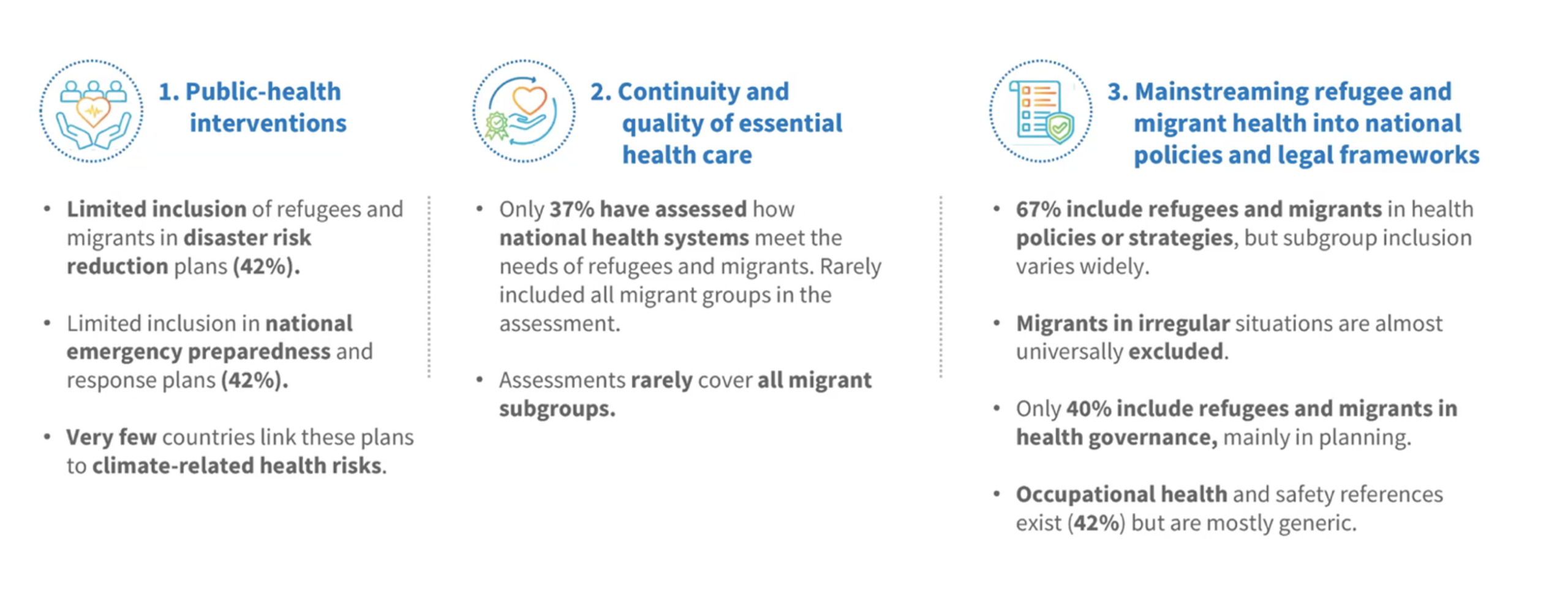 More Countries Refer to Refugees in Health Policies, but Access and Data Gaps Persist Health Equity 30/03/2026 • Stefan Anderson Share this: Share on X (Opens in new window) X Share on LinkedIn (Opens in new window) LinkedIn Share on Facebook (Opens in new window) Facebook Print (Opens in new window) Print Share on Bluesky (Opens in new window) Bluesky First global survey of 93 nations shows two-thirds include these populations in health plans, but none provide equal access to undocumented migrants. More than 60 countries now include refugees and migrants in their national health policies, according to a new World Health Organization (WHO) report tracking progress on commitments first set out by the World Health Assembly in 2019. The finding, drawn from a survey of 93 member states, is the first systematic count of how countries are implementing a resolution that called on governments to ensure refugees and migrants have access to health services, are included in national health planning, and are counted in health data systems. “Many countries have begun integrating refugee and migrant health into national strategies,” said WHO Director-General Tedros Adhanom Ghebreyesus. “Yet gaps remain, particularly in collecting and using migration-related health data, ensuring participation of refugees and migrants in decision-making, and guaranteeing access to care for all, regardless of legal status.” “Like anyone else, refugees and migrants need uninterrupted, affordable and equitable access to health services wherever they are,” Tedros said. While WHO called the findings “encouraging,” the picture the report paints is difficult to read clearly. What “inclusion in a national health policy” actually means for care access for migrants and refugees varies widely – and the report does not name which countries fall where. Two-thirds of the 93 surveyed countries said they include refugees and migrants in their health policies. When asked what level of access different groups receive, 16 countries said refugees can access services on a par with the host population, 14 extended that standard to documented migrant workers, and 11 to asylum seekers. No country surveyed reported providing equal access to migrants in irregular situations – those living without legal status or formal documentation. The positive examples the report does name – from Belgium to Chile – are presented as case studies. Only 37% of countries routinely collect and disseminate migration-related health data. Fewer than 40% train health workers in culturally responsive care. Just 30% have run campaigns to counter misinformation or discrimination, the report found. The report is the first systematic quantification of these indicators, further blurring the picture of progress, as there is no baseline to compare against. The data is also entirely drawn from a voluntary survey completed by member states with no independent verification, meaning the results are unvetted self-assessments. The report explicitly does not rank countries on the success, impact or implementation of their policies, and “did not assess the level of implementation or impact of any given initiative,” meaning real-world outcomes “cannot be evaluated,” it said. The survey also contains no questions about financing, meaning a country can report including refugees in its national health policy while allocating no dedicated budget to deliver on it. “Rather than ranking countries on their progress,” the report notes, it seeks to identify how key gaps can be addressed going forward. The report comes as conflict, climate change and economic insecurity displace more people than ever before. More than one billion people live as refugees or migrants worldwide, though over 800 million remain within their own borders. There are 405 million international migrants, 36.8 million refugees, 8.4 million asylum seekers and 83.4 million internally displaced people. Dr Santino Severoni, head of WHO’s Special Initiative on Health and Migration and lead author of the report, said it was intended as a roadmap for coordinated action across governments, UN agencies, civil society, academia and migrant communities themselves. “The health of refugees and migrants is not a marginal concern: it is a defining issue of our time,” Severoni said. “By acting now, countries can ensure that refugees and migrants are not left behind, and that health systems are stronger, fairer and more prepared for the future.” Data ’emergency’, exclusion from emergency plans Progress roadmap for the World Health Assembly Resolution on migrant and refugee health. The new report follows a first edition published in 2022, which was a literature review of around 82,000 documents that established the scale of health disparities facing refugees and migrants worldwide. Two further progress checks are planned for 2027 and 2029, ahead of the 2030 deadline set by WHA member states for full implementation. The 2022 report identified fragmented data collection as the central structural obstacle to effective policy. That remains unresolved. Severoni described the situation as “almost an emergency.” “It’s not because data is not collected, but because they are collected in a very fragmented way, which makes it very, very difficult for us to have a full picture,” he said. Just 42% of countries include refugees and migrants in emergency preparedness or disaster risk reduction plans. Irregular migrants – those without legal residency status – are entirely absent from those frameworks, even as the crises that drive displacement, from war to climate-related disasters, intensify. “We cannot talk about refugee and migrant health without also addressing emergencies,” said Dr Chikwe Ihekweazu, WHO’s executive director for health emergencies. “Whether it’s a conflict, a climate-related crisis or an epidemic that forces movement, these crises expose the fragility of 