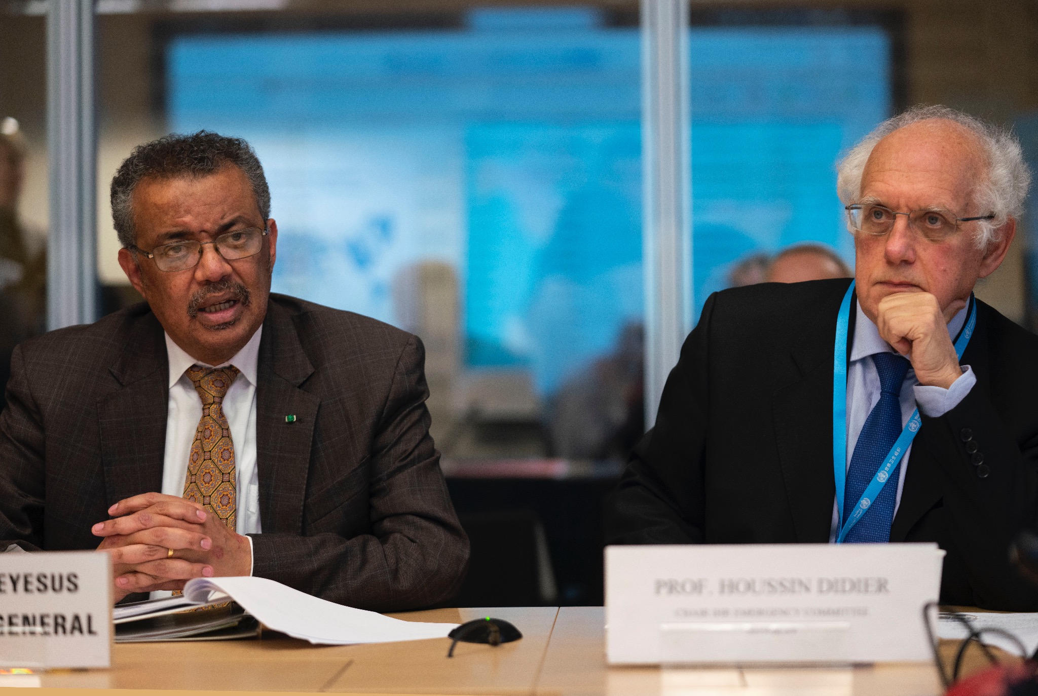 Too late? WHO Director General Dr Tedros Adhanom Gehebreyesus (left) and Didier Houssin, chair of the WHO Emergency Committee on 30 January 2020, when the COVID International Health Emergency was first declared.