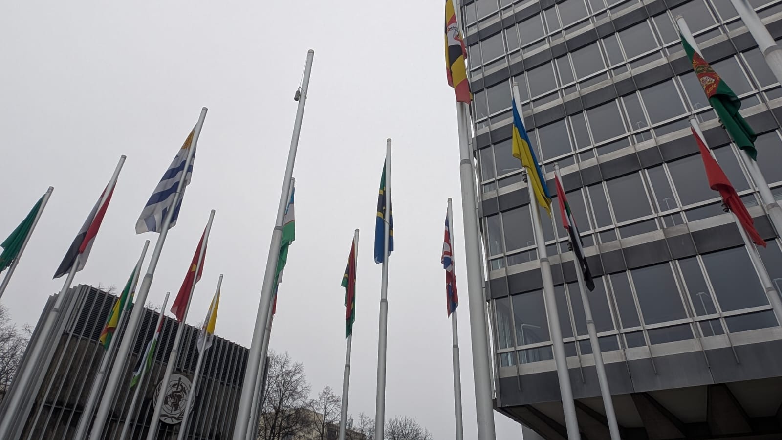 The Missing Star-Spangled Banner: A vacant flagpole stands between the flags of Uruguay and Uganda at the WHO headquarters in Geneva after the United States said it had completed its withdrawal from the World Health Organization.
