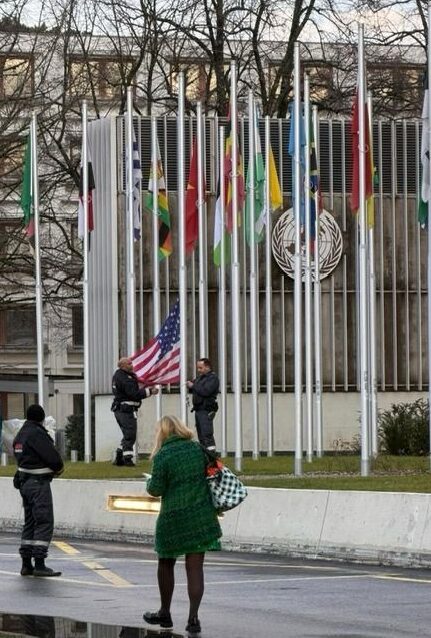 Lowering the stars and stripes from WHO headquarters under a grey Geneva sky Thursday.