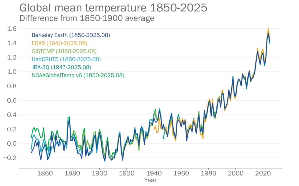 This Year Set to Be Among Top-3 Hottest Years, Says WMO Climate change 06/11/2025 • Disha Shetty Share this: Click to share on X (Opens in new window) X Click to share on LinkedIn (Opens in new window) LinkedIn Click to share on Facebook (Opens in new window) Facebook Click to print (Opens in new window) Print The year 2025 is on track to be among the hottest years on record, according to the latest update from WMO. The year 2025 is set to be among the top three hottest years in the planet’s 176-year observational record, according to the State of the Global Climate Update from the World Meteorological Organization (WMO). The mean near-surface temperature from January to August was 1.42°C (± 0.12°C) above the pre-industrial average, the report said. Depending on what the final mean temperature would be by the end of December, 2025 is likely to end up as the second or the third warmest year on record. WMO’s report comes days before the UN climate summit COP30, set to kick off on Monday in Brazil’s Belém, and is meant to provide evidence to anchor the climate negotiations. “This unprecedented streak of high temperatures, combined with last year’s record increase in greenhouse gas levels, makes it clear that it will be virtually impossible to limit global warming to 1.5°C in the next few years without temporarily overshooting this target,” said WMO Secretary-General Celeste Saulo. “But the science is equally clear that it’s still entirely possible and essential to bring temperatures back down to 1.5°C by the end of the century.” See related story: World on Track for 2.8°C Warming as Paris Agreement Overshoot Now Inevitable Concentrations of heat-trapping greenhouse gases and the ocean heat content, which reached record levels in 2024, have continued to rise in 2025. The past 11 years (2015-2025) will individually have been the 11 warmest years on record. “Each year above 1.5°C will hammer economies, deepen inequalities and inflict irreversible damage. We must act now, at great speed and scale, to make the overshoot as small, as short, and as safe as possible – and bring temperatures back below 1.5°C before the end of the century,” said UN Secretary-General António Guterres, who also cited the WMO report in his statement to the upcoming COP30, imploring countries to be more ambitious in their actions. As temperature rise continues, Arctic and Antarctic ice hit record lows Global mean temperatures are set to breach the Paris agreement target of 1.5°C at least temporarily. In 2024, the current hottest year on record, the mean near-surface temperature was 1.55°C (± 0.13 °C). It temporarily breached the 1.5°C target set by the 2015 Paris Agreement. The 26-month period from June 2023 to August 2025 has seen an extended streak of monthly record-breaking temperatures, with February 2025 being an exception. WMO has attributed the global temperatures in the past three years to the transition from a prolonged La Niña that lasted from 2020 to early 2023 to El Niño conditions. In addition, reductions in aerosols and other factors have likely also played a role in increasing the warming, WMO report said. About 90% of the excess heat in the Earth’s atmosphere goes into the oceans. As a result, ocean heat content has continued to rise in 2025, according to preliminary data, and is above the record 2024 values. Ice-extent in the Arctic sea in March this year was at its lowest maximum extent. The rising temperatures have affected the ice volume at both poles. Arctic sea-ice extent reached its annual maximum of 13.8 million km2 in March, the lowest maximum extent in the satellite record. Arctic sea-ice extent reached its annual minimum of 4.6 million km2 around 6 September, which remained below the long-term average. Antarctic sea-ice extent was the third lowest on record, both for the annual minimum (2.1 million km2) in February 2025, and annual maximum (17.9 million km2) in September 2025. All monitored glaciated regions around the world recorded net mass loss in the hydrological year 2023-24. The long-term sea level rise trends continue despite a small and temporary blip due to naturally occurring factors. Cascading impact of long-term temperatures continue Extreme weather events like flooding, droughts, wildfires, heatwaves and tropical cyclones have occurred throughout the planet, intensified by rising temperatures. Rising temperatures have a cascading impact on extreme weather events, such as devastating rainfall and flooding to brutal heat and wildfires. Until August, such events contributed to displacement across multiple regions, undermining sustainable development and economic progress. But the WMO has highlighted progress made when it comes to early warning systems. Since 2015, the number of countries reporting multi-hazard early warning systems (MHEWSs) has more than doubled – from 56 to 119 in 2024. Nearly 40% countries still lack MHEWSs, and WMO is pushing for regional collaborations to close these gaps. This was also a key focus area at its recently concluded Congress in Geneva. Countries are also using weather and climate data for seasonal outlooks in key sectors like agriculture, water, health and energy. Around two-thirds of countries now provide some form of climate services, varying from essential to advanced level. This number was at 35% just five years ago, WMO said. The organisation has cautioned that, given climatic changes would influence the production of renewable energy, countries need to factor these influences to build reliable and flexible clean energy systems. Image Credits: Unsplash/Misbahul Aulia, WMO. Share this: Click to share on X (Opens in new window) X Click to share on LinkedIn (Opens in new window) LinkedIn Click to share on Facebook (Opens in new window) Facebook Click to print (Opens in new window) Print Combat the infodemic in health information and support health policy reporting from the global South. Our growing netw