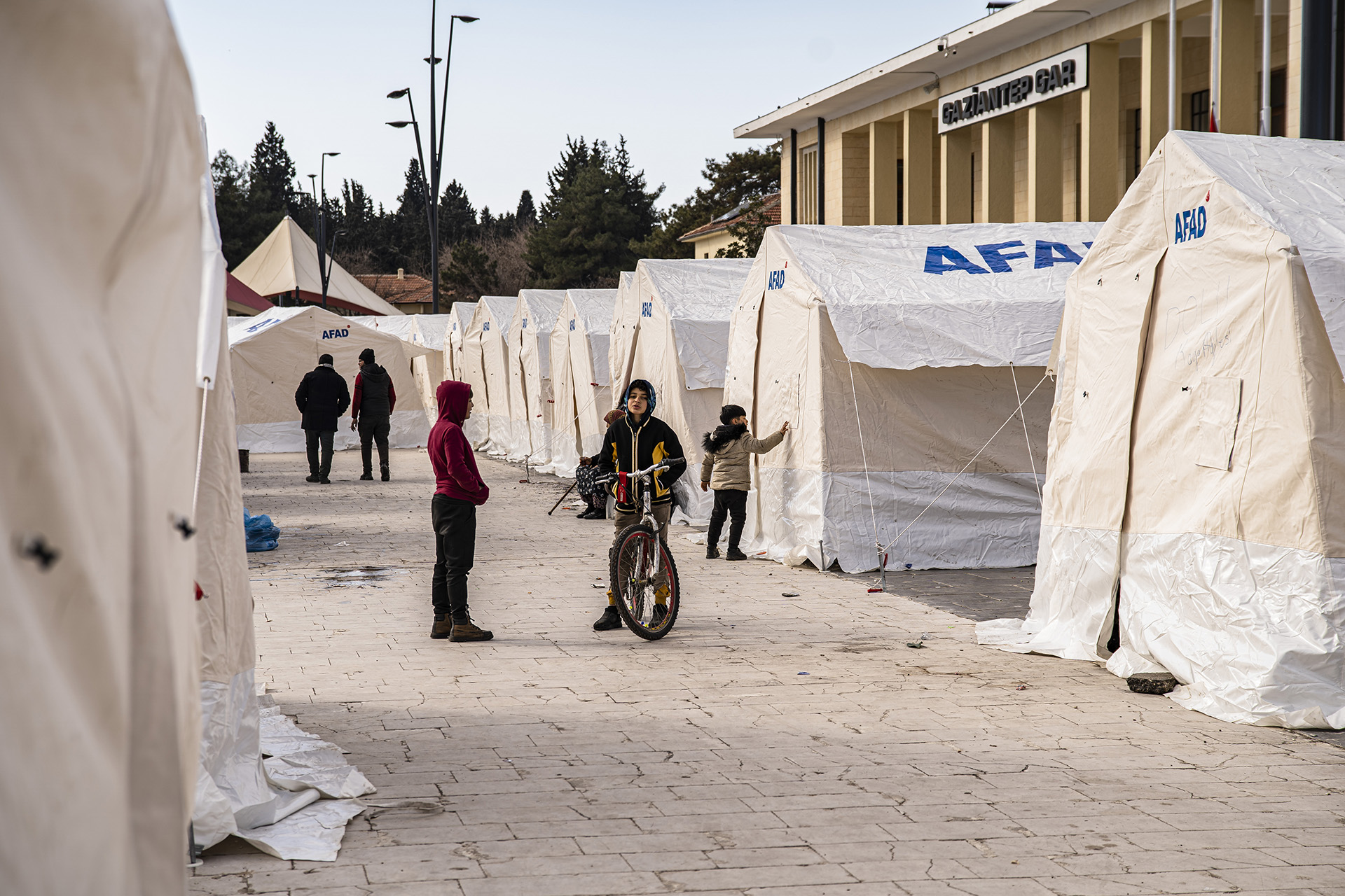 Dozens of white tents stand outside Türkiye’s Gaziantep train station housing Turks and Syrian refugees, shortly after the February 6 2023 earthquake.