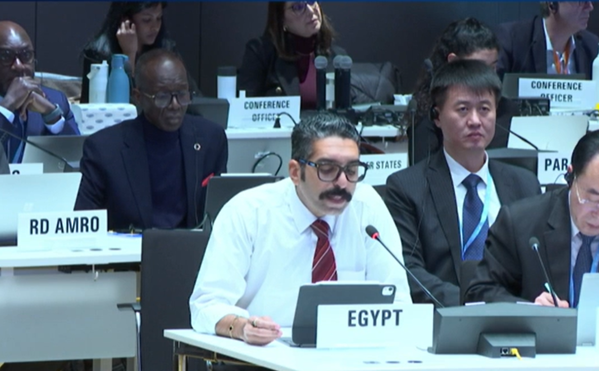 Egypt’s delegate in the EB discussion Thursday on health conditions in the Occupied Palestinian Territory.