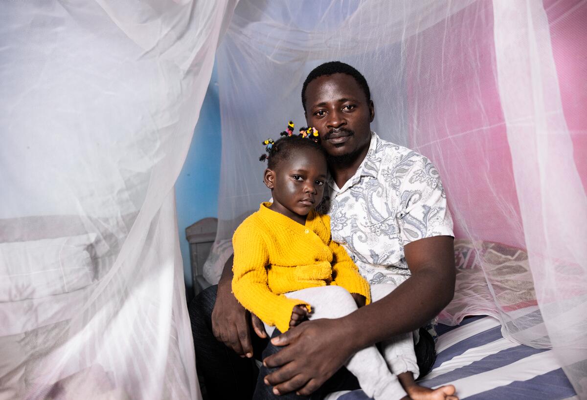 Tomnjong Thadeus with his 3-year-old daughter Gabriella at their home in Soa, Cameroon. Malaria bed nets – still not accessible enough in Africa’s most endemic countries.