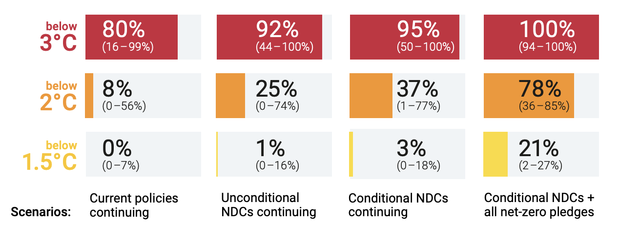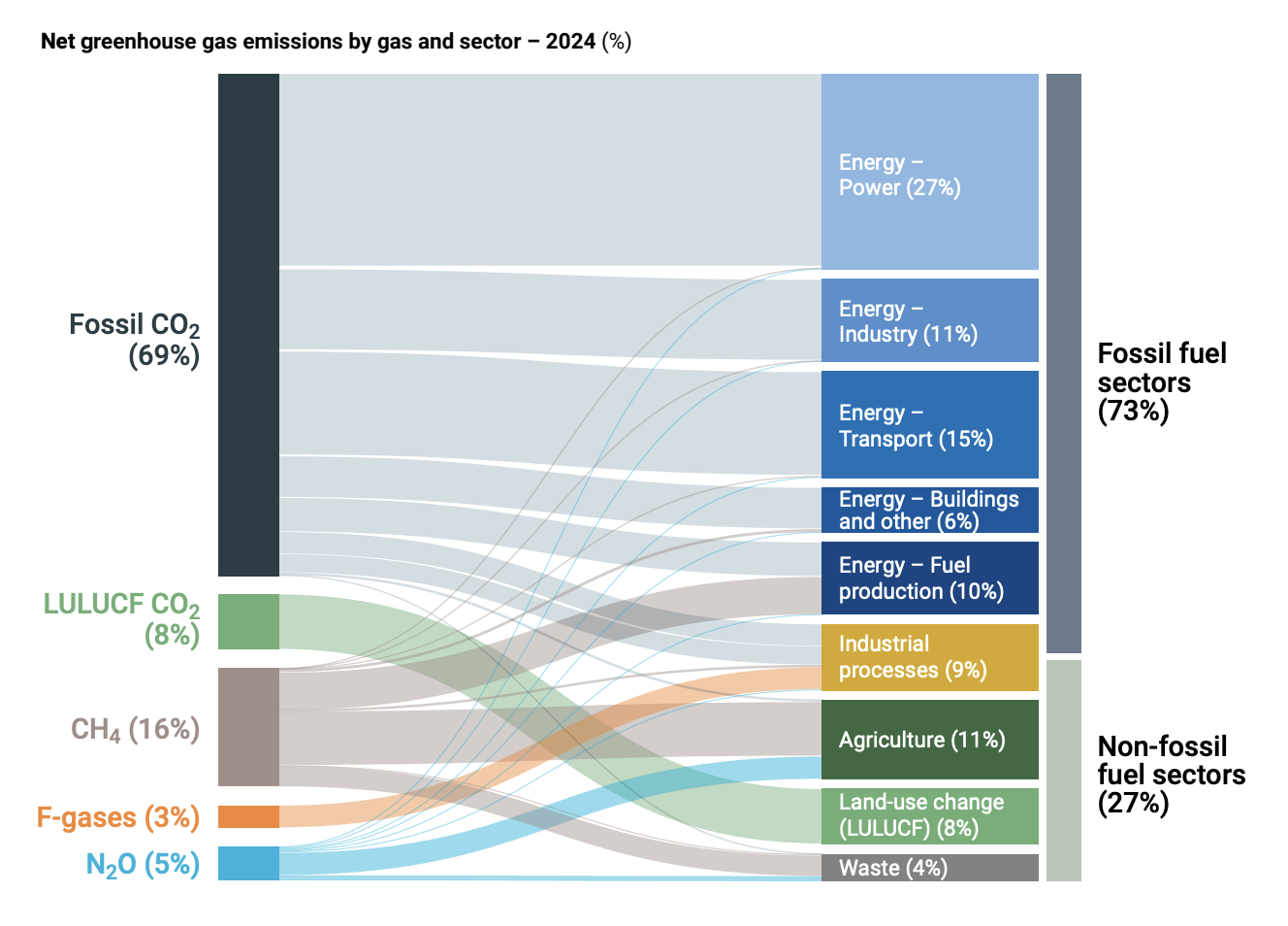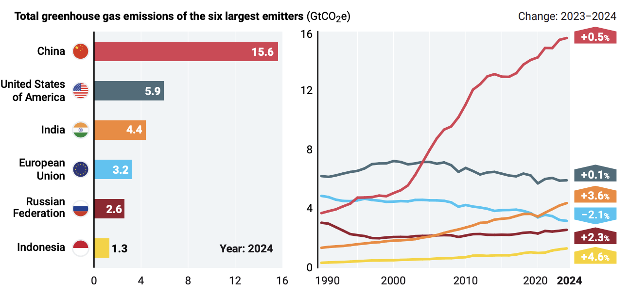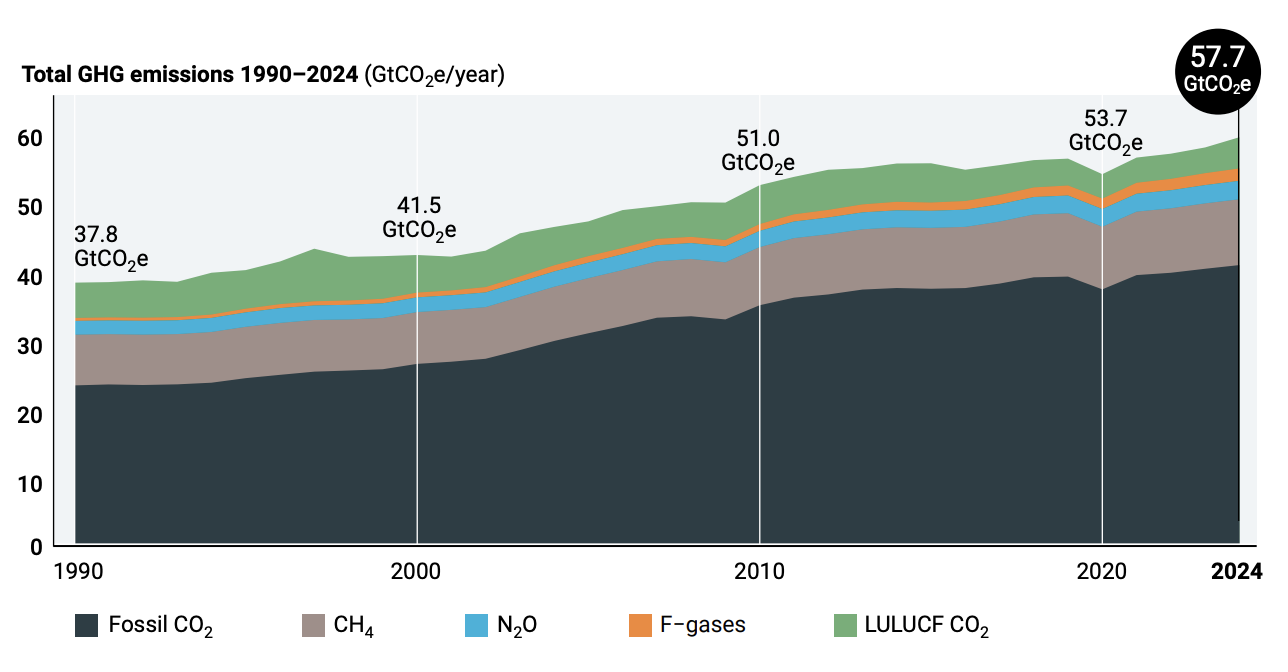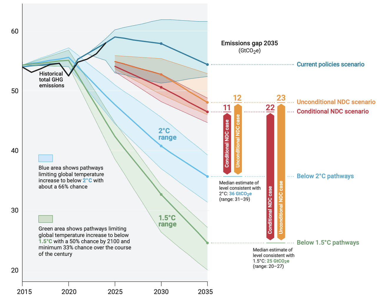 World on Track for 2.8°C Warming as Paris Agreement Overshoot Now Inevitable Climate change 05/11/2025 • Stefan Anderson Share this: Click to share on X (Opens in new window) X Click to share on LinkedIn (Opens in new window) LinkedIn Click to share on Facebook (Opens in new window) Facebook Click to print (Opens in new window) Print UN report finds 1.5°C overshoot now ‘inevitable’ despite improvements in global emissions trajectory. The world is heading for 2.8°C of warming by century’s end under current policies, according to a United Nations assessment released Tuesday that finds new climate pledges have “barely moved the needle” despite a decade of international commitments under the Paris Agreement. The projection represents a decline from the 3.1°C forecast in last year’s assessment, but the UN Environment Programme warns that methodological updates account for 0.1°C of that improvement, while the US withdrawal from the Paris Agreement will erase another 0.1°C, meaning actual policy progress remains minimal. “Nations have had three attempts to deliver promises made under the Paris Agreement, and each time they have landed off target,” said Inger Andersen, executive director of UNEP. “While national climate plans have delivered some progress, it is nowhere near fast enough,” Andersen said. “We still need unprecedented emissions cuts in an increasingly tight window, with an increasingly challenging geopolitical backdrop.” Even if all new climate targets submitted this year are fully implemented, they would reduce global emissions by only 12% by 2035 compared to 2019 levels, falling well short of the 55% reduction required to limit warming to 1.5°C, the Emissions Gap Report finds. Likelihood of limiting warming below a specific temperature limit (%) over the twenty-first century. “We are far from closing the emissions gap, far from getting on track for a 1.5-degree future, far from protecting vulnerable communities from climate catastrophe,” UN Secretary-General António Guterres said. “Continuing to invest in fossil fuels is a dead end. But the task before us remains immense.” “Scientists tell us that a temporary overshoot above 1.5 degrees is now inevitable, starting at the latest in the early 2030s,” Guterres added. “And the path to a liveable future gets steeper by the day. But this is no reason to surrender. It’s a reason to step up and speed up.” To limit overshoot to about 0.3°C and return to 1.5°C by 2100, emissions would need to fall 26% by 2030 and 46% by 2035 compared to 2019 levels, UNEP estimates, a finding Andersen said forces acceptance of a difficult reality. “This situation means we must accept a hard truth: the multi-decadal average of global temperatures will exceed 1.5°C, very likely within the next decade. The task is to make this overshoot minimal and temporary.” Every fraction counts Total net anthropogenic GHG emissions, 1990–2024. Global greenhouse gas emissions rose 2.3% to a record 57.7 gigatons of CO2 equivalent in 2024, the largest annual increase since the 2000s. The rise occurred across all major sectors and greenhouse gas categories, UNEP said. Land use change and deforestation proved decisive in driving the surge, with net emissions from this source jumping 21% and accounting for 53% of the overall increase. The rise was driven by extensive wildfires and land clearing, exacerbated by El Niño conditions that increased drought risk, particularly in South America. Only 60 of 193 parties to the Paris Agreement submitted or announced new climate targets for 2035 by the Sept. 30 deadline, representing about 63% of global greenhouse gas emissions. The gap between these pledges and what is needed remains enormous. “The emissions gap has narrowed compared with last year’s assessment, but it remains large,” said Anne Olhoff, the report’s chief scientific editor. “Every fraction of a degree matters in terms of lives lost, in terms of losses and damages, in terms of the risk of irreversible tipping points. So we really need to go as low as we can. The challenge has increased significantly because of the lack of action over the last five years.” Global GHG emissions under different scenarios and the emissions gap in 2030 and 2035. Meanwhile, fossil fuel production continues to expand in direct contradiction to climate pledges. The UN-backed Production Gap Report, released in September, found governments collectively plan to produce more than double the amount of coal, oil and gas in 2030 than would be consistent with limiting warming to 1.5°C. The 100 largest oil and gas companies have production strategies on track to exceed their share of 1.5°C-consistent production by 189% in 2040, while private bank lending to fossil fuel activities surged 29% to $611 billion in 2024, exceeding green sector lending by 15%. “We are not seeing anyone reducing their oil production,” Andersen said. “We are seeing step up on renewables and various other things – energy efficiency, carbon capture, forestry – but actually looking at production, is not there [in the NDCs].” Some 73 of 87 countries reviewed in a recent Lancet report provided net explicit fossil fuel subsidies in 2023, allocating nearly $1 trillion in direct support. Including indirect subsidies, the global figure rises to over $7 trillion, according to the International Monetary Fund, more than governments spend annually on education and about two-thirds of what they spend on healthcare. Fifteen countries allocated more funds to net fossil fuel subsidies than to national health budgets in 2024, according to The Lancet. Total net GHG emissions by gas, sector, and fossil or non-fossil category in 2024. Olhoff noted that the report’s calculations exclude military emissions, which remain unaccounted for under UN climate agreements due to lack of reliable data. Studies suggest the world’s armed forces generate roughly 5.5% of total glo